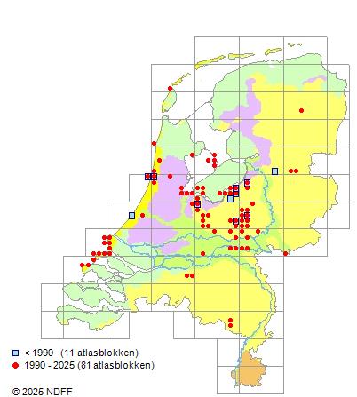 Het aantal atlasblokken (5x5 km) waarin de soort is gemeld binnen een periode van vijf jaar (vanaf 1980) of twintig jaar. Niet gecorrigeerd voor waarnemersinspanning en het aantal doorgegeven waarnemingen kan sterk variëren per periode, dus een trend in verspreiding kan hier niet direct uit worden afgelezen. Het opgegeven jaartal is het eerste jaar van de periode. Bron: gevalideerde waarnemingen uit de NDFF.