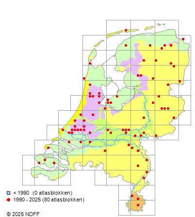 Het aantal atlasblokken (5x5 km) waarin de soort is gemeld binnen een periode van vijf jaar (vanaf 1980) of twintig jaar. Niet gecorrigeerd voor waarnemersinspanning en het aantal doorgegeven waarnemingen kan sterk variëren per periode, dus een trend in verspreiding kan hier niet direct uit worden afgelezen. Het opgegeven jaartal is het eerste jaar van de periode. Bron: gevalideerde waarnemingen uit de NDFF.