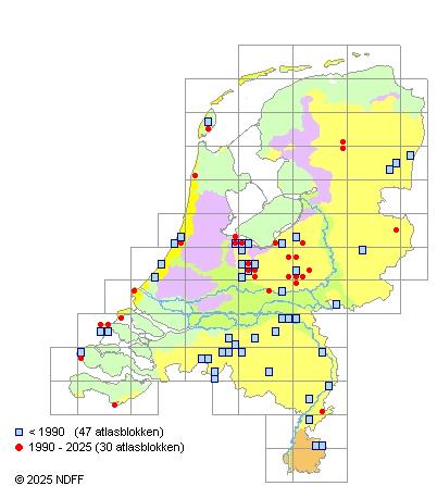 Het aantal atlasblokken (5x5 km) waarin de soort is gemeld binnen een periode van vijf jaar (vanaf 1980) of twintig jaar. Niet gecorrigeerd voor waarnemersinspanning en het aantal doorgegeven waarnemingen kan sterk variëren per periode, dus een trend in verspreiding kan hier niet direct uit worden afgelezen. Het opgegeven jaartal is het eerste jaar van de periode. Bron: gevalideerde waarnemingen uit de NDFF.