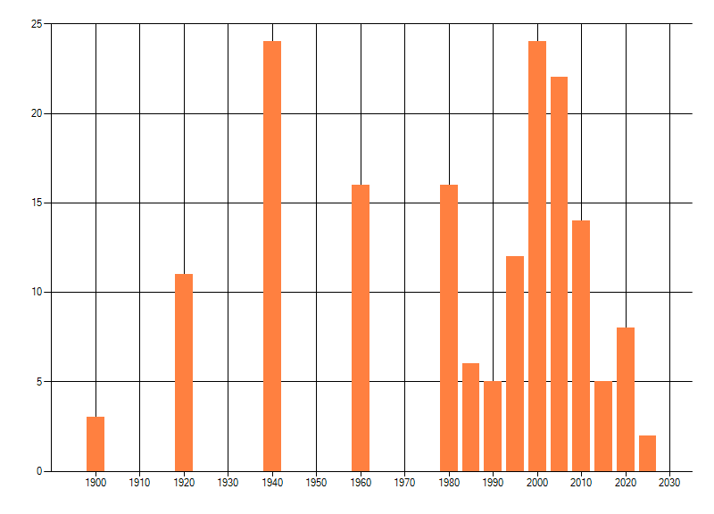 Het aantal atlasblokken (5x5 km) waarin de soort is gemeld binnen een periode van vijf jaar (vanaf 1980) of twintig jaar. Niet gecorrigeerd voor waarnemersinspanning en het aantal doorgegeven waarnemingen kan sterk variëren per periode, dus een trend in verspreiding kan hier niet direct uit worden afgelezen. Het opgegeven jaartal is het eerste jaar van de periode. Bron: gevalideerde waarnemingen uit de NDFF.