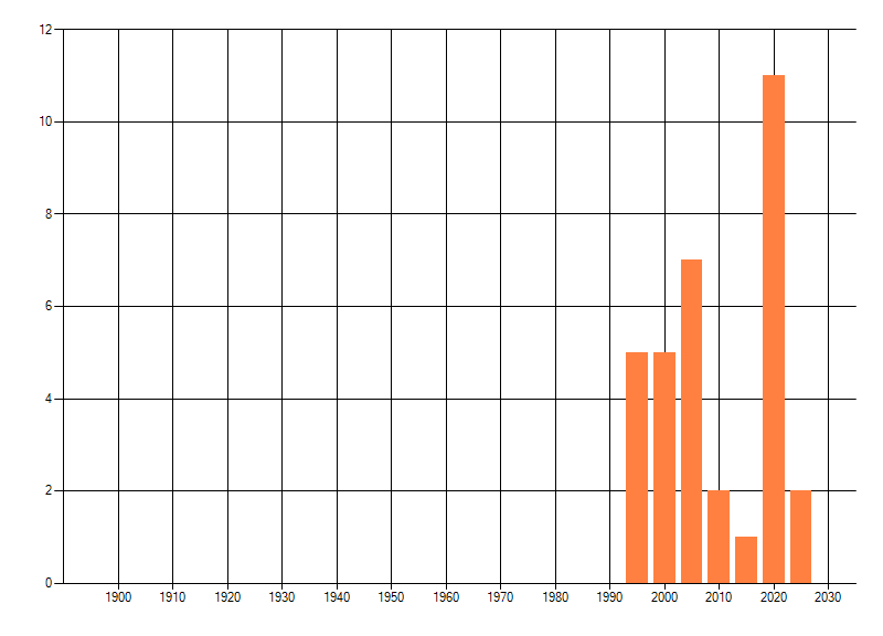Het aantal atlasblokken (5x5 km) waarin de soort is gemeld binnen een periode van vijf jaar (vanaf 1980) of twintig jaar. Niet gecorrigeerd voor waarnemersinspanning en het aantal doorgegeven waarnemingen kan sterk variëren per periode, dus een trend in verspreiding kan hier niet direct uit worden afgelezen. Het opgegeven jaartal is het eerste jaar van de periode. Bron: gevalideerde waarnemingen uit de NDFF.