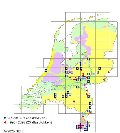 Het aantal atlasblokken (5x5 km) waarin de soort is gemeld binnen een periode van vijf jaar (vanaf 1980) of twintig jaar. Niet gecorrigeerd voor waarnemersinspanning en het aantal doorgegeven waarnemingen kan sterk variëren per periode, dus een trend in verspreiding kan hier niet direct uit worden afgelezen. Het opgegeven jaartal is het eerste jaar van de periode. Bron: gevalideerde waarnemingen uit de NDFF.