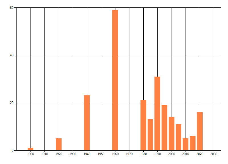 Het aantal atlasblokken (5x5 km) waarin de soort is gemeld binnen een periode van vijf jaar (vanaf 1980) of twintig jaar. Niet gecorrigeerd voor waarnemersinspanning en het aantal doorgegeven waarnemingen kan sterk variëren per periode, dus een trend in verspreiding kan hier niet direct uit worden afgelezen. Het opgegeven jaartal is het eerste jaar van de periode. Bron: gevalideerde waarnemingen uit de NDFF.