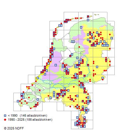 Het aantal atlasblokken (5x5 km) waarin de soort is gemeld binnen een periode van vijf jaar (vanaf 1980) of twintig jaar. Niet gecorrigeerd voor waarnemersinspanning en het aantal doorgegeven waarnemingen kan sterk variëren per periode, dus een trend in verspreiding kan hier niet direct uit worden afgelezen. Het opgegeven jaartal is het eerste jaar van de periode. Bron: gevalideerde waarnemingen uit de NDFF.