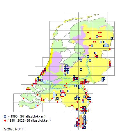 Het aantal atlasblokken (5x5 km) waarin de soort is gemeld binnen een periode van vijf jaar (vanaf 1980) of twintig jaar. Niet gecorrigeerd voor waarnemersinspanning en het aantal doorgegeven waarnemingen kan sterk variëren per periode, dus een trend in verspreiding kan hier niet direct uit worden afgelezen. Het opgegeven jaartal is het eerste jaar van de periode. Bron: gevalideerde waarnemingen uit de NDFF.