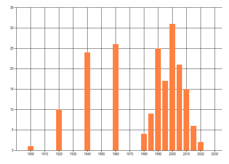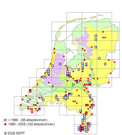 Het aantal atlasblokken (5x5 km) waarin de soort is gemeld binnen een periode van vijf jaar (vanaf 1980) of twintig jaar. Niet gecorrigeerd voor waarnemersinspanning en het aantal doorgegeven waarnemingen kan sterk variëren per periode, dus een trend in verspreiding kan hier niet direct uit worden afgelezen. Het opgegeven jaartal is het eerste jaar van de periode. Bron: gevalideerde waarnemingen uit de NDFF.