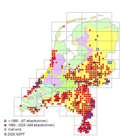 Het aantal atlasblokken (5x5 km) waarin de soort is gemeld binnen een periode van vijf jaar (vanaf 1980) of twintig jaar. Niet gecorrigeerd voor waarnemersinspanning en het aantal doorgegeven waarnemingen kan sterk variëren per periode, dus een trend in verspreiding kan hier niet direct uit worden afgelezen. Het opgegeven jaartal is het eerste jaar van de periode. Bron: gevalideerde waarnemingen uit de NDFF.