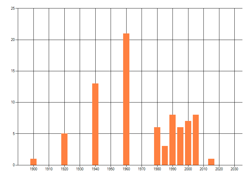Het aantal atlasblokken (5x5 km) waarin de soort is gemeld binnen een periode van vijf jaar (vanaf 1980) of twintig jaar. Niet gecorrigeerd voor waarnemersinspanning en het aantal doorgegeven waarnemingen kan sterk variëren per periode, dus een trend in verspreiding kan hier niet direct uit worden afgelezen. Het opgegeven jaartal is het eerste jaar van de periode. Bron: gevalideerde waarnemingen uit de NDFF.