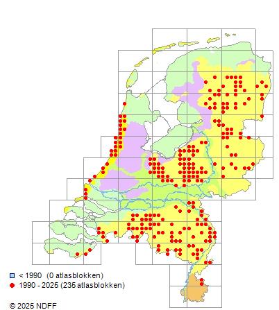 Het aantal atlasblokken (5x5 km) waarin de soort is gemeld binnen een periode van vijf jaar (vanaf 1980) of twintig jaar. Niet gecorrigeerd voor waarnemersinspanning en het aantal doorgegeven waarnemingen kan sterk variëren per periode, dus een trend in verspreiding kan hier niet direct uit worden afgelezen. Het opgegeven jaartal is het eerste jaar van de periode. Bron: gevalideerde waarnemingen uit de NDFF.