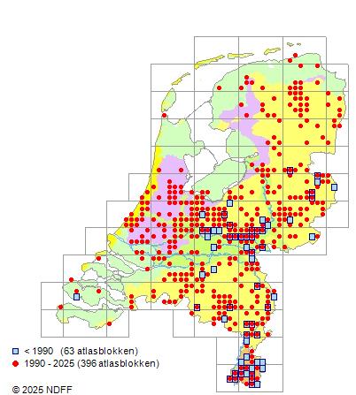 Het aantal atlasblokken (5x5 km) waarin de soort is gemeld binnen een periode van vijf jaar (vanaf 1980) of twintig jaar. Niet gecorrigeerd voor waarnemersinspanning en het aantal doorgegeven waarnemingen kan sterk variëren per periode, dus een trend in verspreiding kan hier niet direct uit worden afgelezen. Het opgegeven jaartal is het eerste jaar van de periode. Bron: gevalideerde waarnemingen uit de NDFF.