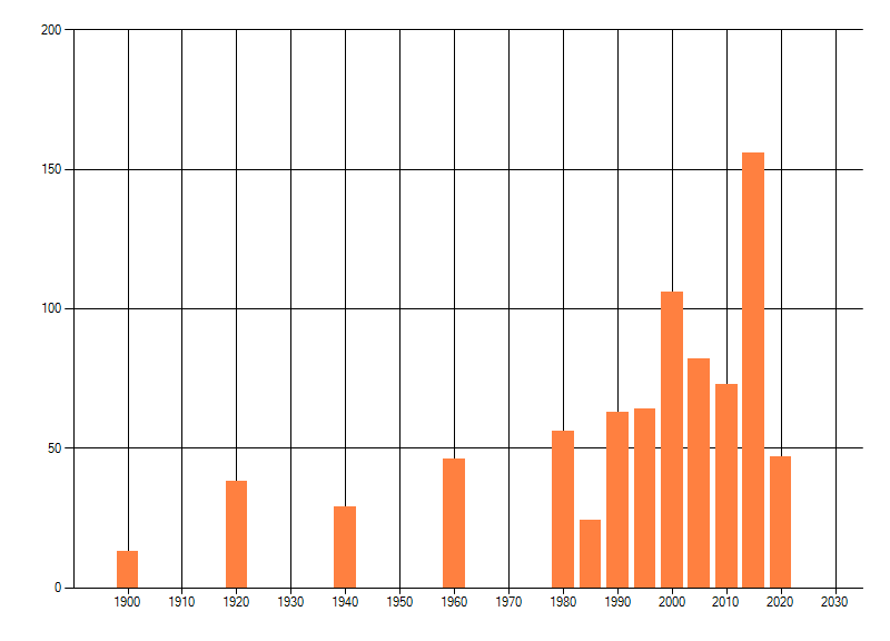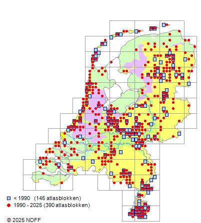 Het aantal atlasblokken (5x5 km) waarin de soort is gemeld binnen een periode van vijf jaar (vanaf 1980) of twintig jaar. Niet gecorrigeerd voor waarnemersinspanning en het aantal doorgegeven waarnemingen kan sterk variëren per periode, dus een trend in verspreiding kan hier niet direct uit worden afgelezen. Het opgegeven jaartal is het eerste jaar van de periode. Bron: gevalideerde waarnemingen uit de NDFF.