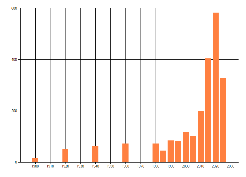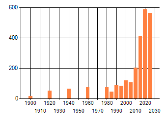 Het aantal atlasblokken (5x5 km) waarin de soort is gemeld binnen een periode van vijf jaar (vanaf 1980) of twintig jaar. Niet gecorrigeerd voor waarnemersinspanning en het aantal doorgegeven waarnemingen kan sterk variëren per periode, dus een trend in verspreiding kan hier niet direct uit worden afgelezen. Het opgegeven jaartal is het eerste jaar van de periode. Bron: gevalideerde waarnemingen uit de NDFF.