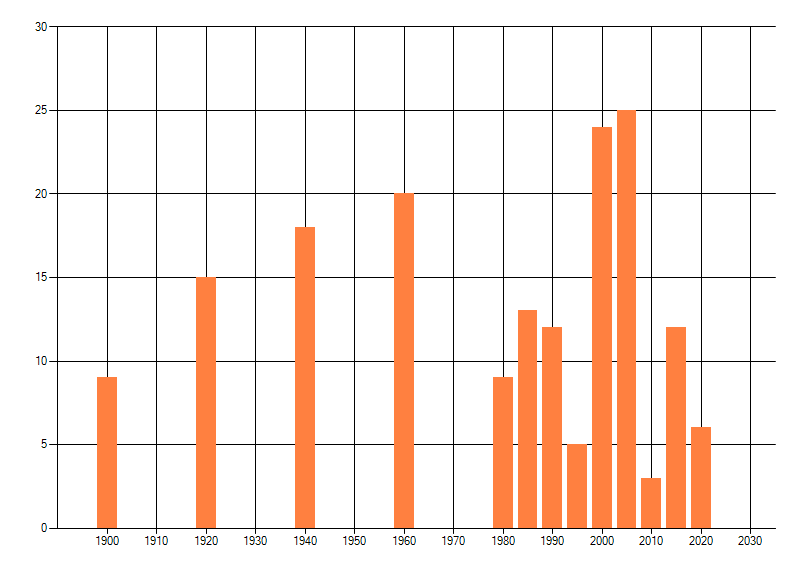 Het aantal atlasblokken (5x5 km) waarin de soort is gemeld binnen een periode van vijf jaar (vanaf 1980) of twintig jaar. Niet gecorrigeerd voor waarnemersinspanning en het aantal doorgegeven waarnemingen kan sterk variëren per periode, dus een trend in verspreiding kan hier niet direct uit worden afgelezen. Het opgegeven jaartal is het eerste jaar van de periode. Bron: gevalideerde waarnemingen uit de NDFF.