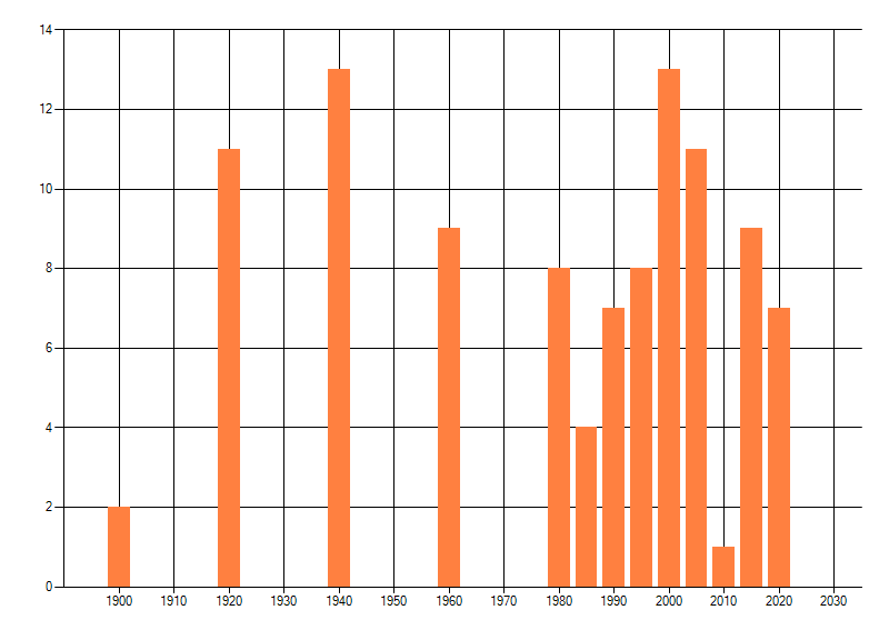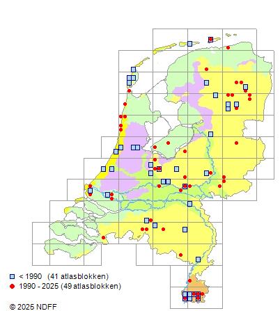 Het aantal atlasblokken (5x5 km) waarin de soort is gemeld binnen een periode van vijf jaar (vanaf 1980) of twintig jaar. Niet gecorrigeerd voor waarnemersinspanning en het aantal doorgegeven waarnemingen kan sterk variëren per periode, dus een trend in verspreiding kan hier niet direct uit worden afgelezen. Het opgegeven jaartal is het eerste jaar van de periode. Bron: gevalideerde waarnemingen uit de NDFF.