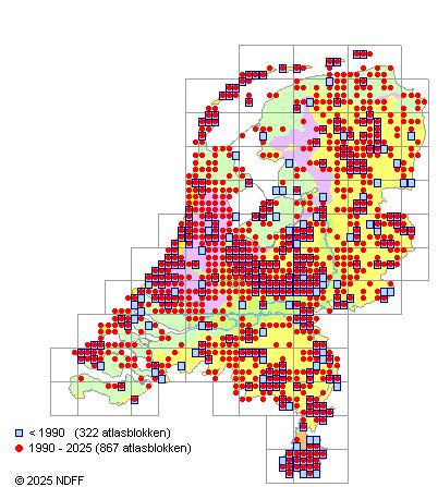 Het aantal atlasblokken (5x5 km) waarin de soort is gemeld binnen een periode van vijf jaar (vanaf 1980) of twintig jaar. Niet gecorrigeerd voor waarnemersinspanning en het aantal doorgegeven waarnemingen kan sterk variëren per periode, dus een trend in verspreiding kan hier niet direct uit worden afgelezen. Het opgegeven jaartal is het eerste jaar van de periode. Bron: gevalideerde waarnemingen uit de NDFF.