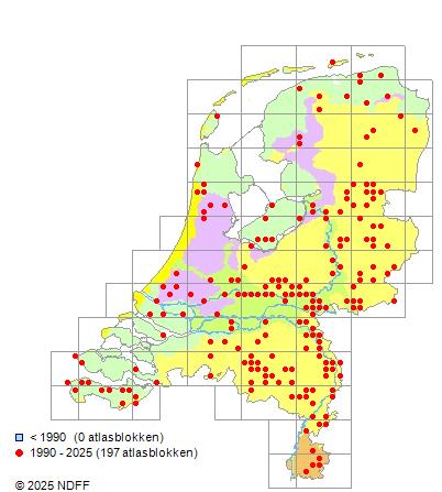 Het aantal atlasblokken (5x5 km) waarin de soort is gemeld binnen een periode van vijf jaar (vanaf 1980) of twintig jaar. Niet gecorrigeerd voor waarnemersinspanning en het aantal doorgegeven waarnemingen kan sterk variëren per periode, dus een trend in verspreiding kan hier niet direct uit worden afgelezen. Het opgegeven jaartal is het eerste jaar van de periode. Bron: gevalideerde waarnemingen uit de NDFF.