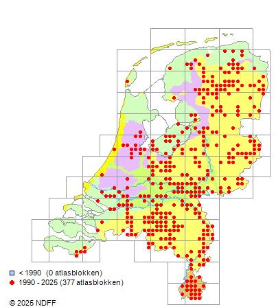 Het aantal atlasblokken (5x5 km) waarin de soort is gemeld binnen een periode van vijf jaar (vanaf 1980) of twintig jaar. Niet gecorrigeerd voor waarnemersinspanning en het aantal doorgegeven waarnemingen kan sterk variëren per periode, dus een trend in verspreiding kan hier niet direct uit worden afgelezen. Het opgegeven jaartal is het eerste jaar van de periode. Bron: gevalideerde waarnemingen uit de NDFF.