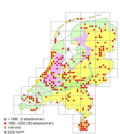 Het aantal atlasblokken (5x5 km) waarin de soort is gemeld binnen een periode van vijf jaar (vanaf 1980) of twintig jaar. Niet gecorrigeerd voor waarnemersinspanning en het aantal doorgegeven waarnemingen kan sterk variëren per periode, dus een trend in verspreiding kan hier niet direct uit worden afgelezen. Het opgegeven jaartal is het eerste jaar van de periode. Bron: gevalideerde waarnemingen uit de NDFF.