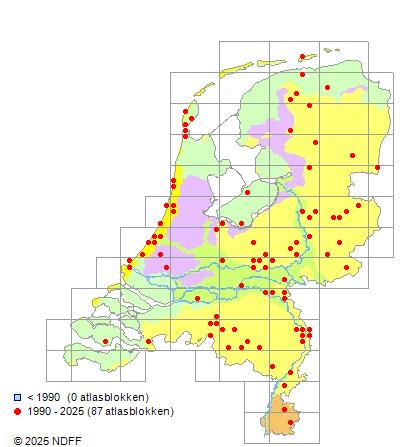 Het aantal atlasblokken (5x5 km) waarin de soort is gemeld binnen een periode van vijf jaar (vanaf 1980) of twintig jaar. Niet gecorrigeerd voor waarnemersinspanning en het aantal doorgegeven waarnemingen kan sterk variëren per periode, dus een trend in verspreiding kan hier niet direct uit worden afgelezen. Het opgegeven jaartal is het eerste jaar van de periode. Bron: gevalideerde waarnemingen uit de NDFF.