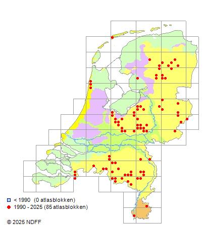 Het aantal atlasblokken (5x5 km) waarin de soort is gemeld binnen een periode van vijf jaar (vanaf 1980) of twintig jaar. Niet gecorrigeerd voor waarnemersinspanning en het aantal doorgegeven waarnemingen kan sterk variëren per periode, dus een trend in verspreiding kan hier niet direct uit worden afgelezen. Het opgegeven jaartal is het eerste jaar van de periode. Bron: gevalideerde waarnemingen uit de NDFF.