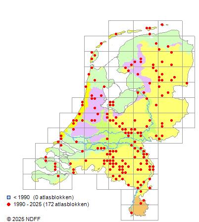 Het aantal atlasblokken (5x5 km) waarin de soort is gemeld binnen een periode van vijf jaar (vanaf 1980) of twintig jaar. Niet gecorrigeerd voor waarnemersinspanning en het aantal doorgegeven waarnemingen kan sterk variëren per periode, dus een trend in verspreiding kan hier niet direct uit worden afgelezen. Het opgegeven jaartal is het eerste jaar van de periode. Bron: gevalideerde waarnemingen uit de NDFF.