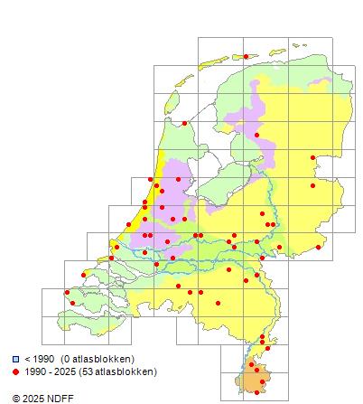 Het aantal atlasblokken (5x5 km) waarin de soort is gemeld binnen een periode van vijf jaar (vanaf 1980) of twintig jaar. Niet gecorrigeerd voor waarnemersinspanning en het aantal doorgegeven waarnemingen kan sterk variëren per periode, dus een trend in verspreiding kan hier niet direct uit worden afgelezen. Het opgegeven jaartal is het eerste jaar van de periode. Bron: gevalideerde waarnemingen uit de NDFF.