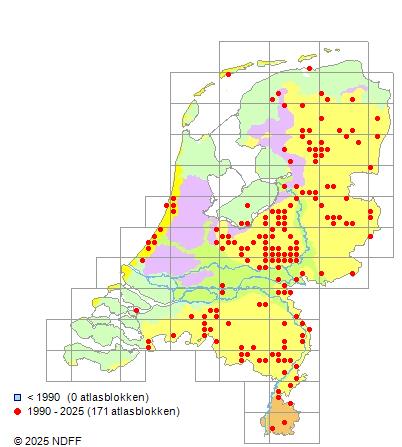 Het aantal atlasblokken (5x5 km) waarin de soort is gemeld binnen een periode van vijf jaar (vanaf 1980) of twintig jaar. Niet gecorrigeerd voor waarnemersinspanning en het aantal doorgegeven waarnemingen kan sterk variëren per periode, dus een trend in verspreiding kan hier niet direct uit worden afgelezen. Het opgegeven jaartal is het eerste jaar van de periode. Bron: gevalideerde waarnemingen uit de NDFF.
