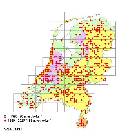 Het aantal atlasblokken (5x5 km) waarin de soort is gemeld binnen een periode van vijf jaar (vanaf 1980) of twintig jaar. Niet gecorrigeerd voor waarnemersinspanning en het aantal doorgegeven waarnemingen kan sterk variëren per periode, dus een trend in verspreiding kan hier niet direct uit worden afgelezen. Het opgegeven jaartal is het eerste jaar van de periode. Bron: gevalideerde waarnemingen uit de NDFF.