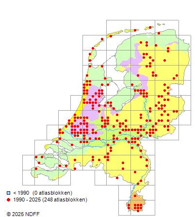 Het aantal atlasblokken (5x5 km) waarin de soort is gemeld binnen een periode van vijf jaar (vanaf 1980) of twintig jaar. Niet gecorrigeerd voor waarnemersinspanning en het aantal doorgegeven waarnemingen kan sterk variëren per periode, dus een trend in verspreiding kan hier niet direct uit worden afgelezen. Het opgegeven jaartal is het eerste jaar van de periode. Bron: gevalideerde waarnemingen uit de NDFF.