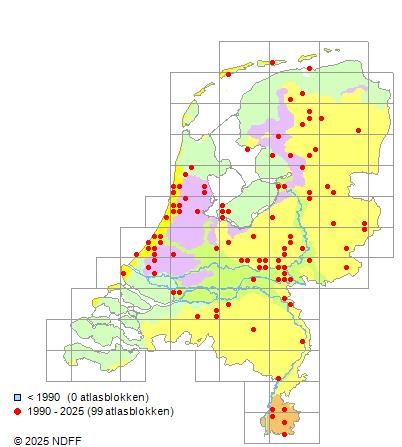 Het aantal atlasblokken (5x5 km) waarin de soort is gemeld binnen een periode van vijf jaar (vanaf 1980) of twintig jaar. Niet gecorrigeerd voor waarnemersinspanning en het aantal doorgegeven waarnemingen kan sterk variëren per periode, dus een trend in verspreiding kan hier niet direct uit worden afgelezen. Het opgegeven jaartal is het eerste jaar van de periode. Bron: gevalideerde waarnemingen uit de NDFF.