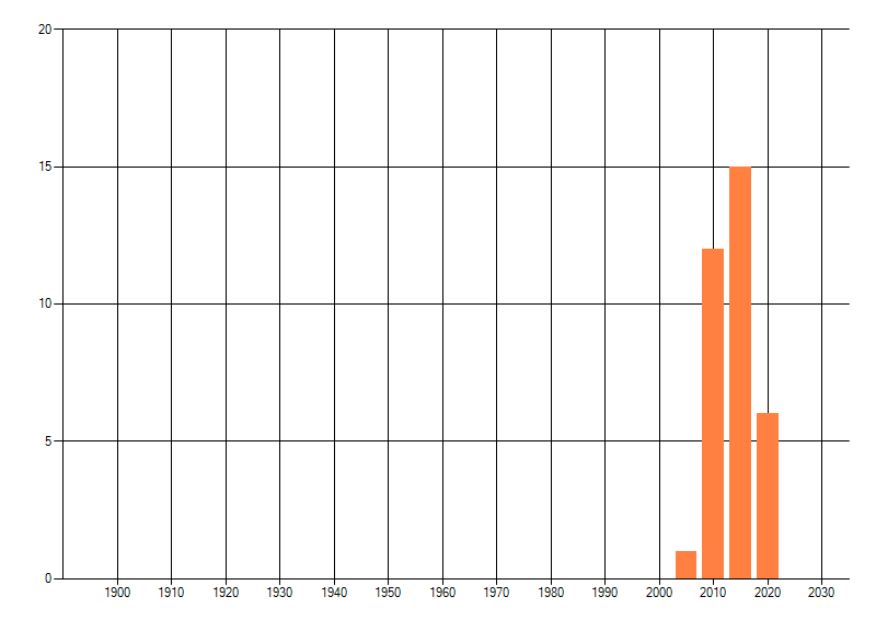 Het aantal atlasblokken (5x5 km) waarin de soort is gemeld binnen een periode van vijf jaar (vanaf 1980) of twintig jaar. Niet gecorrigeerd voor waarnemersinspanning en het aantal doorgegeven waarnemingen kan sterk variëren per periode, dus een trend in verspreiding kan hier niet direct uit worden afgelezen. Het opgegeven jaartal is het eerste jaar van de periode. Bron: gevalideerde waarnemingen uit de NDFF.