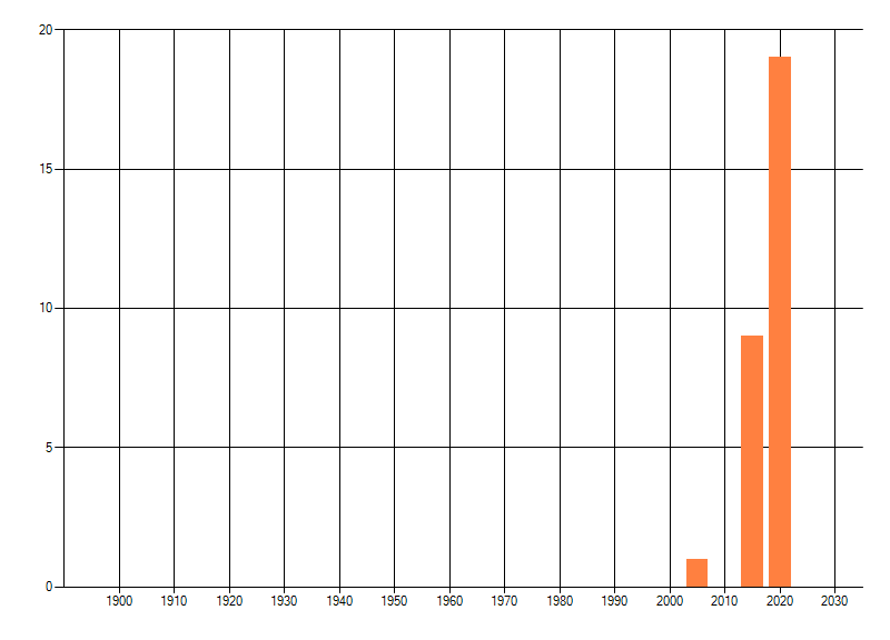 Het aantal atlasblokken (5x5 km) waarin de soort is gemeld binnen een periode van vijf jaar (vanaf 1980) of twintig jaar. Niet gecorrigeerd voor waarnemersinspanning en het aantal doorgegeven waarnemingen kan sterk variëren per periode, dus een trend in verspreiding kan hier niet direct uit worden afgelezen. Het opgegeven jaartal is het eerste jaar van de periode. Bron: gevalideerde waarnemingen uit de NDFF.