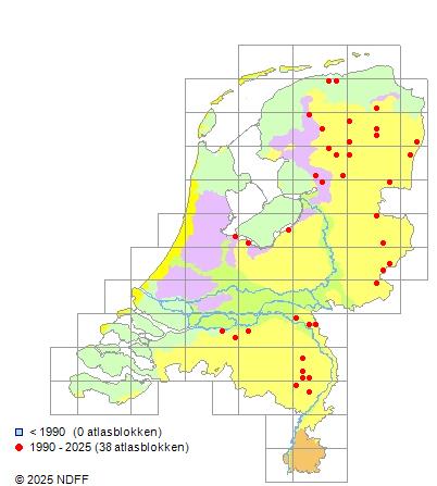 Het aantal atlasblokken (5x5 km) waarin de soort is gemeld binnen een periode van vijf jaar (vanaf 1980) of twintig jaar. Niet gecorrigeerd voor waarnemersinspanning en het aantal doorgegeven waarnemingen kan sterk variëren per periode, dus een trend in verspreiding kan hier niet direct uit worden afgelezen. Het opgegeven jaartal is het eerste jaar van de periode. Bron: gevalideerde waarnemingen uit de NDFF.