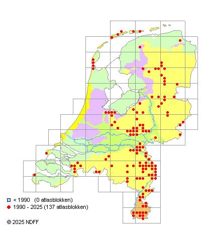 Het aantal atlasblokken (5x5 km) waarin de soort is gemeld binnen een periode van vijf jaar (vanaf 1980) of twintig jaar. Niet gecorrigeerd voor waarnemersinspanning en het aantal doorgegeven waarnemingen kan sterk variëren per periode, dus een trend in verspreiding kan hier niet direct uit worden afgelezen. Het opgegeven jaartal is het eerste jaar van de periode. Bron: gevalideerde waarnemingen uit de NDFF.