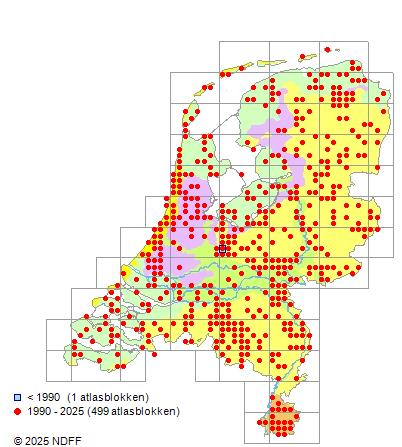 Het aantal atlasblokken (5x5 km) waarin de soort is gemeld binnen een periode van vijf jaar (vanaf 1980) of twintig jaar. Niet gecorrigeerd voor waarnemersinspanning en het aantal doorgegeven waarnemingen kan sterk variëren per periode, dus een trend in verspreiding kan hier niet direct uit worden afgelezen. Het opgegeven jaartal is het eerste jaar van de periode. Bron: gevalideerde waarnemingen uit de NDFF.