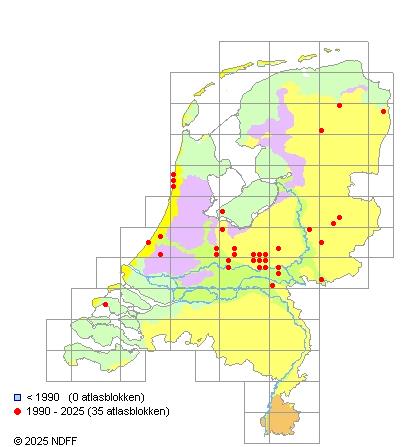 Het aantal atlasblokken (5x5 km) waarin de soort is gemeld binnen een periode van vijf jaar (vanaf 1980) of twintig jaar. Niet gecorrigeerd voor waarnemersinspanning en het aantal doorgegeven waarnemingen kan sterk variëren per periode, dus een trend in verspreiding kan hier niet direct uit worden afgelezen. Het opgegeven jaartal is het eerste jaar van de periode. Bron: gevalideerde waarnemingen uit de NDFF.