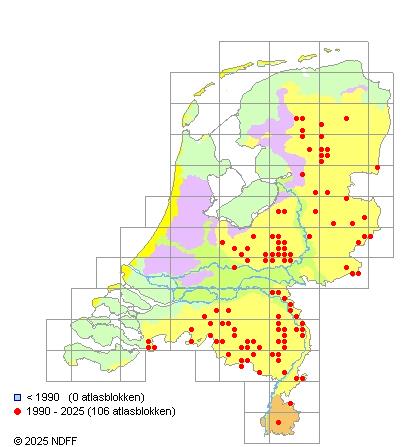Het aantal atlasblokken (5x5 km) waarin de soort is gemeld binnen een periode van vijf jaar (vanaf 1980) of twintig jaar. Niet gecorrigeerd voor waarnemersinspanning en het aantal doorgegeven waarnemingen kan sterk variëren per periode, dus een trend in verspreiding kan hier niet direct uit worden afgelezen. Het opgegeven jaartal is het eerste jaar van de periode. Bron: gevalideerde waarnemingen uit de NDFF.