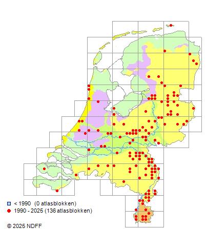 Het aantal atlasblokken (5x5 km) waarin de soort is gemeld binnen een periode van vijf jaar (vanaf 1980) of twintig jaar. Niet gecorrigeerd voor waarnemersinspanning en het aantal doorgegeven waarnemingen kan sterk variëren per periode, dus een trend in verspreiding kan hier niet direct uit worden afgelezen. Het opgegeven jaartal is het eerste jaar van de periode. Bron: gevalideerde waarnemingen uit de NDFF.
