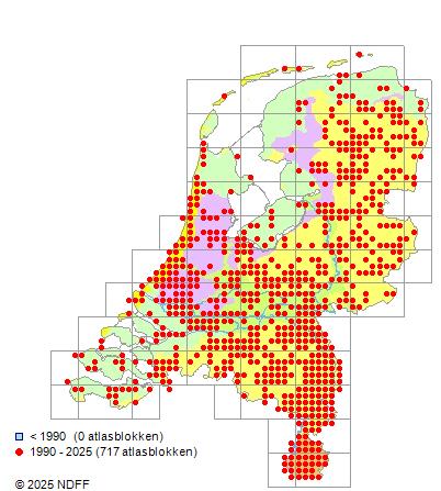 Het aantal atlasblokken (5x5 km) waarin de soort is gemeld binnen een periode van vijf jaar (vanaf 1980) of twintig jaar. Niet gecorrigeerd voor waarnemersinspanning en het aantal doorgegeven waarnemingen kan sterk variëren per periode, dus een trend in verspreiding kan hier niet direct uit worden afgelezen. Het opgegeven jaartal is het eerste jaar van de periode. Bron: gevalideerde waarnemingen uit de NDFF.