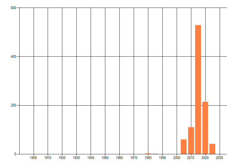 Het aantal atlasblokken (5x5 km) waarin de soort is gemeld binnen een periode van vijf jaar (vanaf 1980) of twintig jaar. Niet gecorrigeerd voor waarnemersinspanning en het aantal doorgegeven waarnemingen kan sterk variëren per periode, dus een trend in verspreiding kan hier niet direct uit worden afgelezen. Het opgegeven jaartal is het eerste jaar van de periode. Bron: gevalideerde waarnemingen uit de NDFF.