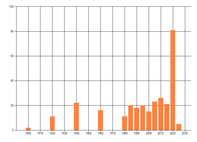 Het aantal atlasblokken (5x5 km) waarin de soort is gemeld binnen een periode van vijf jaar (vanaf 1980) of twintig jaar. Niet gecorrigeerd voor waarnemersinspanning en het aantal doorgegeven waarnemingen kan sterk variëren per periode, dus een trend in verspreiding kan hier niet direct uit worden afgelezen. Het opgegeven jaartal is het eerste jaar van de periode. Bron: gevalideerde waarnemingen uit de NDFF.