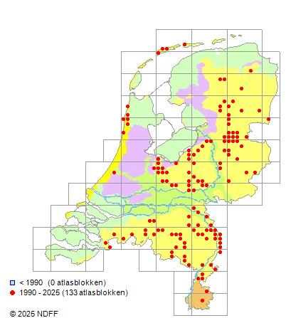 Het aantal atlasblokken (5x5 km) waarin de soort is gemeld binnen een periode van vijf jaar (vanaf 1980) of twintig jaar. Niet gecorrigeerd voor waarnemersinspanning en het aantal doorgegeven waarnemingen kan sterk variëren per periode, dus een trend in verspreiding kan hier niet direct uit worden afgelezen. Het opgegeven jaartal is het eerste jaar van de periode. Bron: gevalideerde waarnemingen uit de NDFF.
