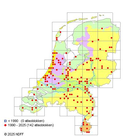 Het aantal atlasblokken (5x5 km) waarin de soort is gemeld binnen een periode van vijf jaar (vanaf 1980) of twintig jaar. Niet gecorrigeerd voor waarnemersinspanning en het aantal doorgegeven waarnemingen kan sterk variëren per periode, dus een trend in verspreiding kan hier niet direct uit worden afgelezen. Het opgegeven jaartal is het eerste jaar van de periode. Bron: gevalideerde waarnemingen uit de NDFF.