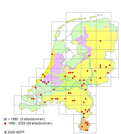 Het aantal atlasblokken (5x5 km) waarin de soort is gemeld binnen een periode van vijf jaar (vanaf 1980) of twintig jaar. Niet gecorrigeerd voor waarnemersinspanning en het aantal doorgegeven waarnemingen kan sterk variëren per periode, dus een trend in verspreiding kan hier niet direct uit worden afgelezen. Het opgegeven jaartal is het eerste jaar van de periode. Bron: gevalideerde waarnemingen uit de NDFF.