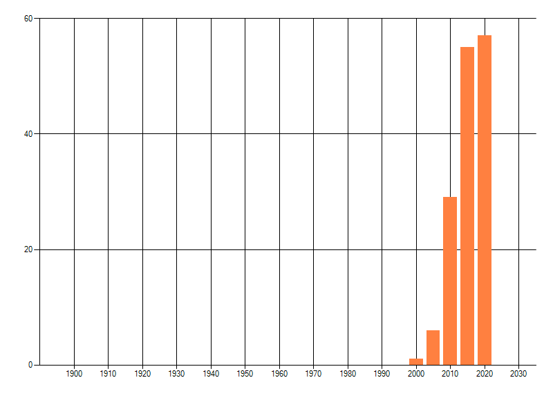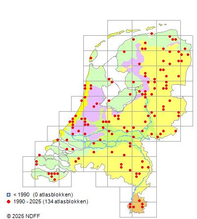 Het aantal atlasblokken (5x5 km) waarin de soort is gemeld binnen een periode van vijf jaar (vanaf 1980) of twintig jaar. Niet gecorrigeerd voor waarnemersinspanning en het aantal doorgegeven waarnemingen kan sterk variëren per periode, dus een trend in verspreiding kan hier niet direct uit worden afgelezen. Het opgegeven jaartal is het eerste jaar van de periode. Bron: gevalideerde waarnemingen uit de NDFF.
