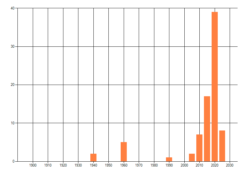 Het aantal atlasblokken (5x5 km) waarin de soort is gemeld binnen een periode van vijf jaar (vanaf 1980) of twintig jaar. Niet gecorrigeerd voor waarnemersinspanning en het aantal doorgegeven waarnemingen kan sterk variëren per periode, dus een trend in verspreiding kan hier niet direct uit worden afgelezen. Het opgegeven jaartal is het eerste jaar van de periode. Bron: gevalideerde waarnemingen uit de NDFF.