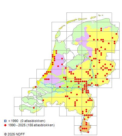 Het aantal atlasblokken (5x5 km) waarin de soort is gemeld binnen een periode van vijf jaar (vanaf 1980) of twintig jaar. Niet gecorrigeerd voor waarnemersinspanning en het aantal doorgegeven waarnemingen kan sterk variëren per periode, dus een trend in verspreiding kan hier niet direct uit worden afgelezen. Het opgegeven jaartal is het eerste jaar van de periode. Bron: gevalideerde waarnemingen uit de NDFF.