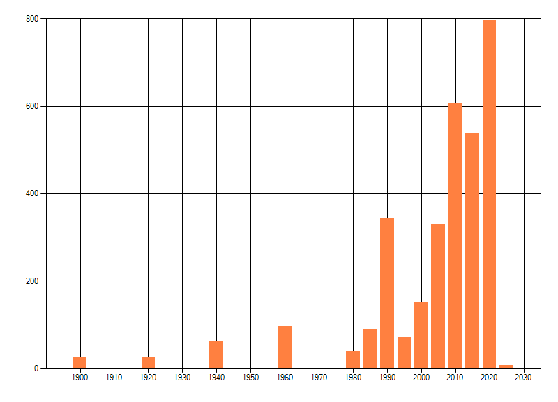 Het aantal atlasblokken (5x5 km) waarin de soort is gemeld binnen een periode van vijf jaar (vanaf 1980) of twintig jaar. Niet gecorrigeerd voor waarnemersinspanning en het aantal doorgegeven waarnemingen kan sterk variëren per periode, dus een trend in verspreiding kan hier niet direct uit worden afgelezen. Het opgegeven jaartal is het eerste jaar van de periode. Bron: gevalideerde waarnemingen uit de NDFF.