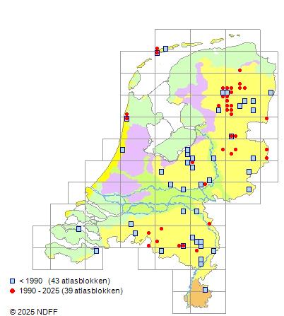 Het aantal atlasblokken (5x5 km) waarin de soort is gemeld binnen een periode van vijf jaar (vanaf 1980) of twintig jaar. Niet gecorrigeerd voor waarnemersinspanning en het aantal doorgegeven waarnemingen kan sterk variëren per periode, dus een trend in verspreiding kan hier niet direct uit worden afgelezen. Het opgegeven jaartal is het eerste jaar van de periode. Bron: gevalideerde waarnemingen uit de NDFF.