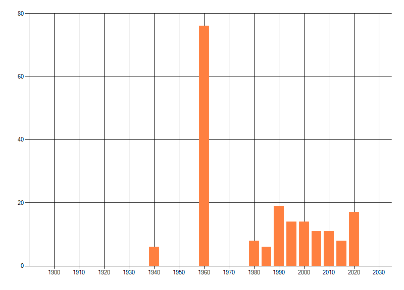 Het aantal atlasblokken (5x5 km) waarin de soort is gemeld binnen een periode van vijf jaar (vanaf 1980) of twintig jaar. Niet gecorrigeerd voor waarnemersinspanning en het aantal doorgegeven waarnemingen kan sterk variëren per periode, dus een trend in verspreiding kan hier niet direct uit worden afgelezen. Het opgegeven jaartal is het eerste jaar van de periode. Bron: gevalideerde waarnemingen uit de NDFF.